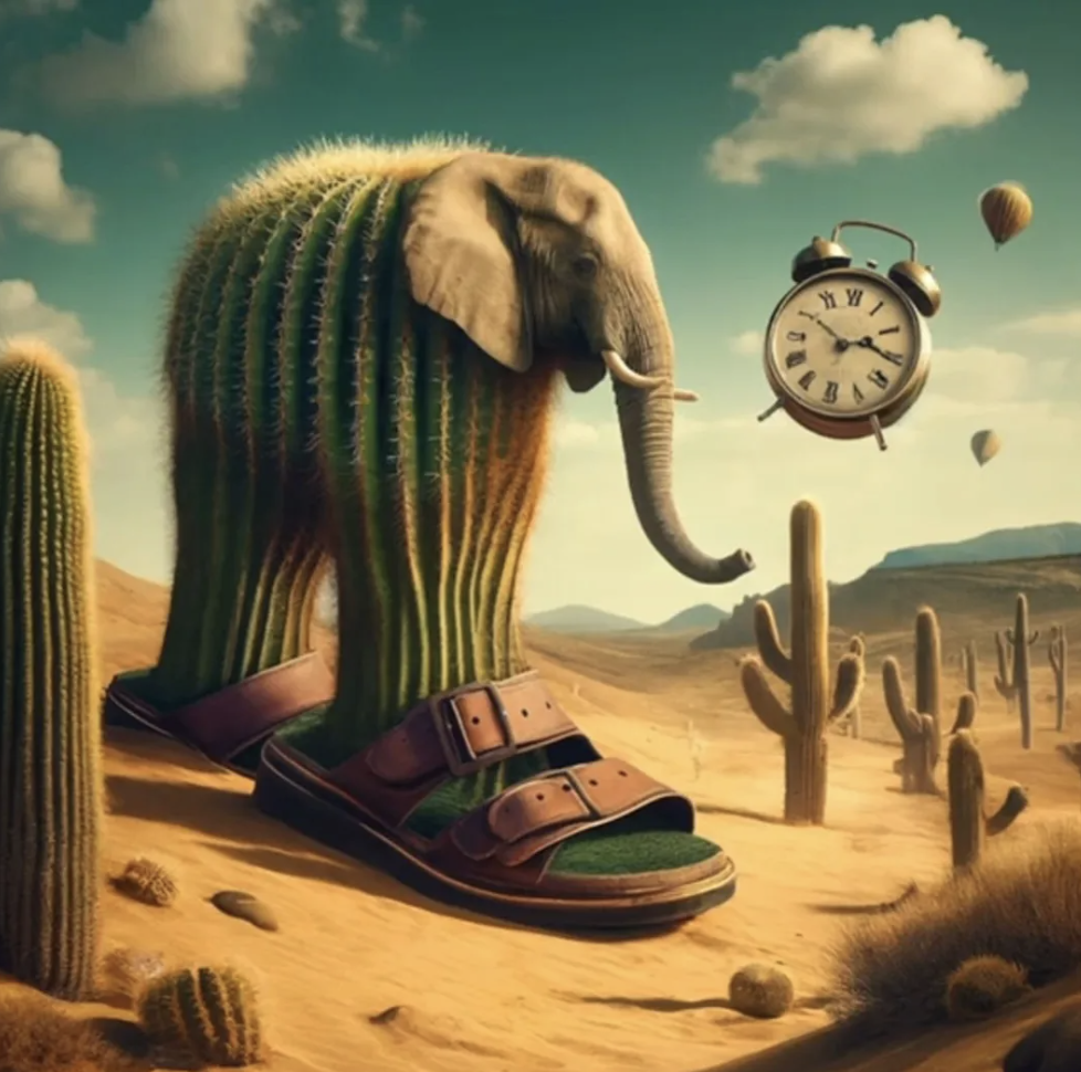 선인장 다리를 가진 코끼리가 샌들을 신었다.