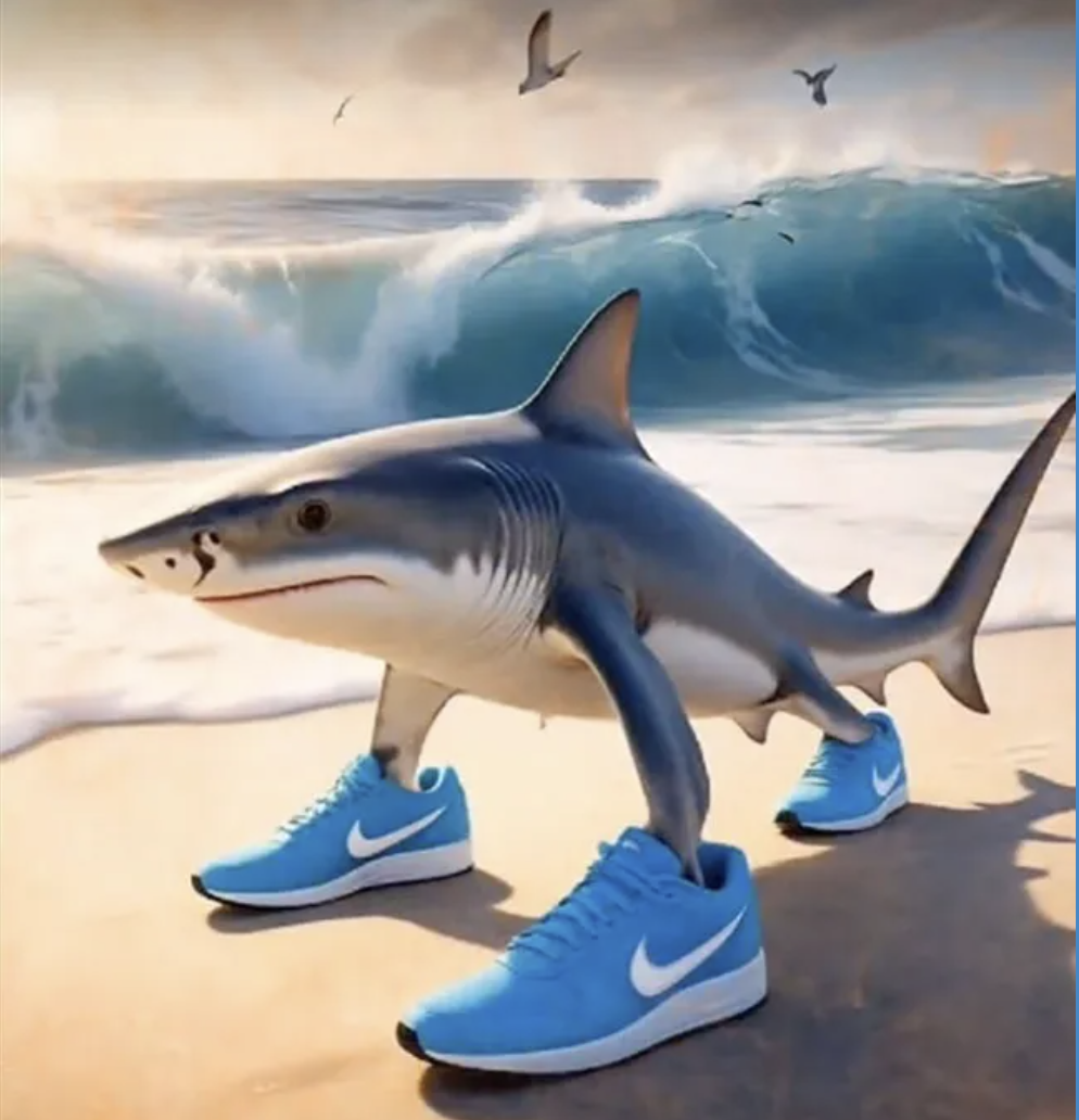 운동화 신은 상어가 해변을 거닐며 무심하게 말합니다.