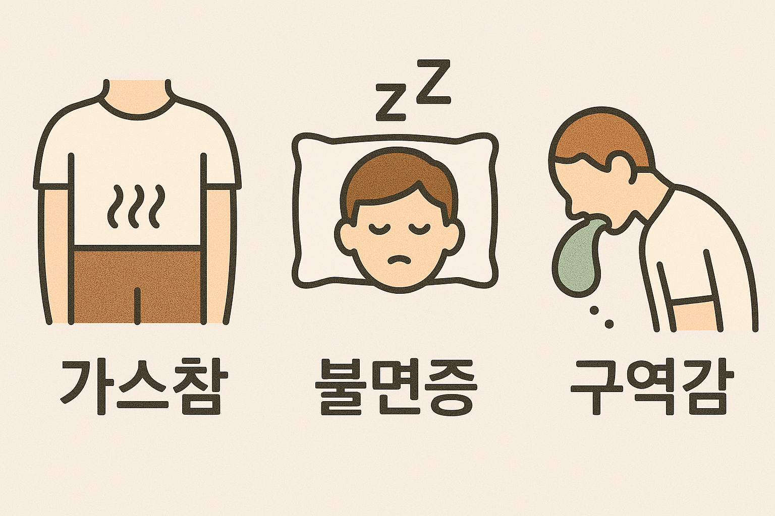 A. 설사, 복통, 어지러움, 불면, 구역감 등이 대표적입니다. 알레르기 외에도 간기능 이상, 출혈 같은 증상도 드물게 발생할 수 있어 주의가 필요합니다.