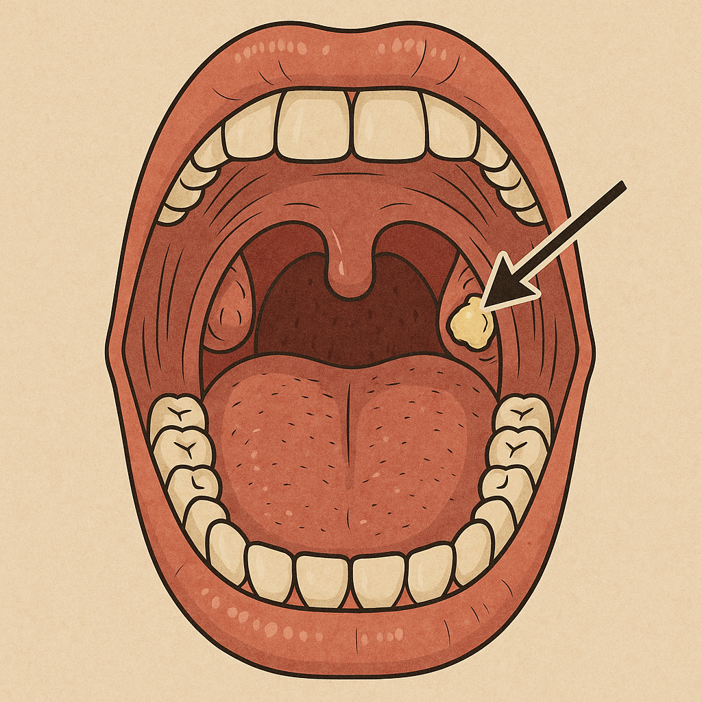 편도선에 생기는 작은 하얀 돌처럼 생긴 물질로, 음식물 찌꺼기·세균·점액이 뭉쳐 굳어 생깁니다.