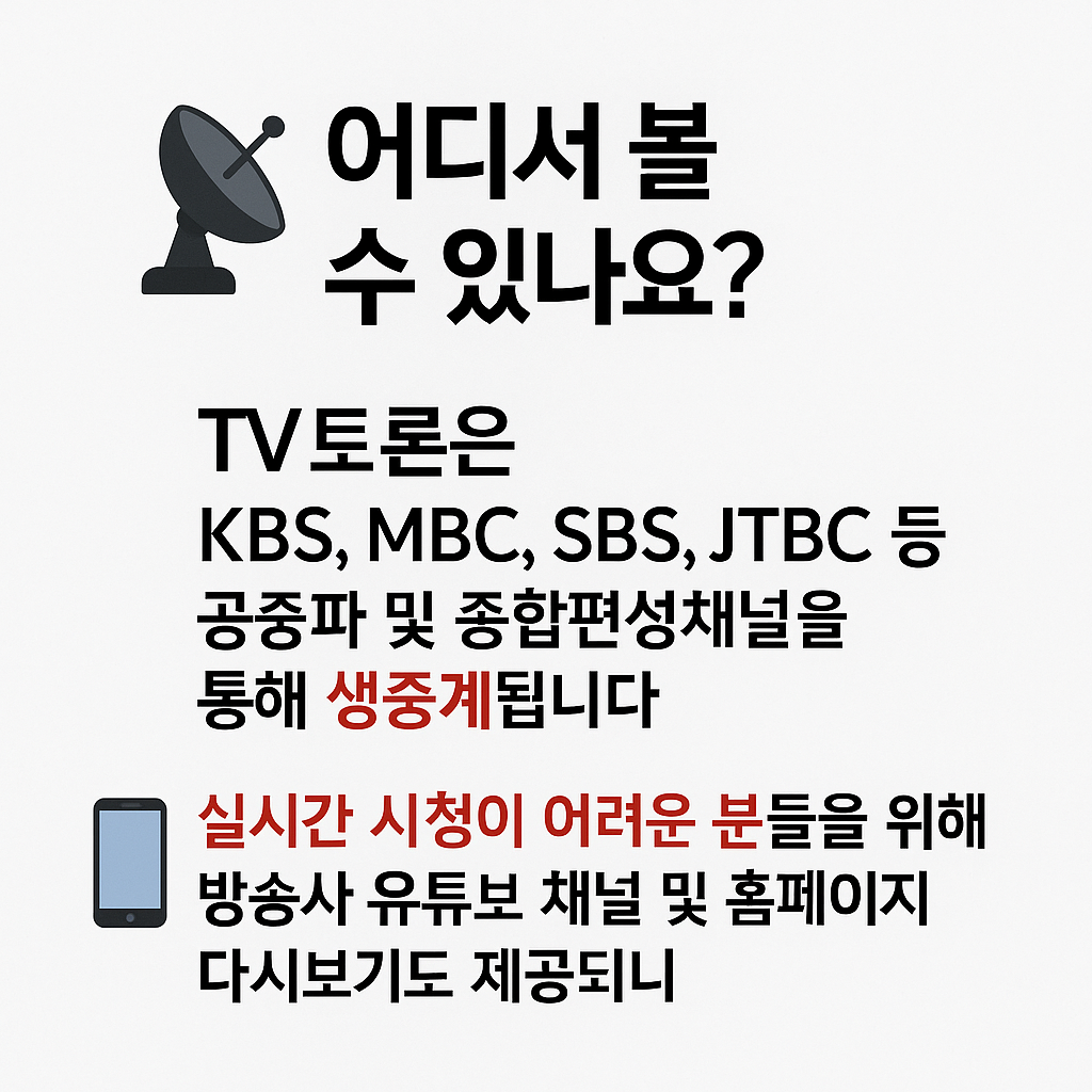 - ⏰ 시간 체크 필수: 대부분 토론은 오후 8시10시, 기타 후보 토론은 10시12시